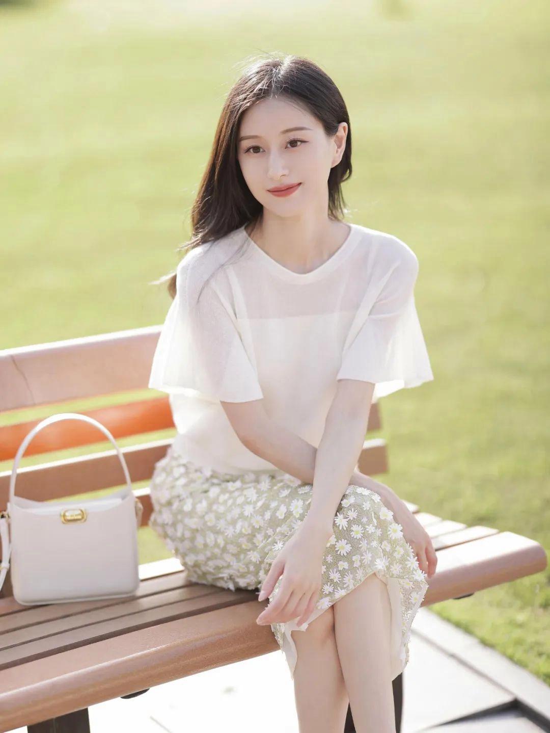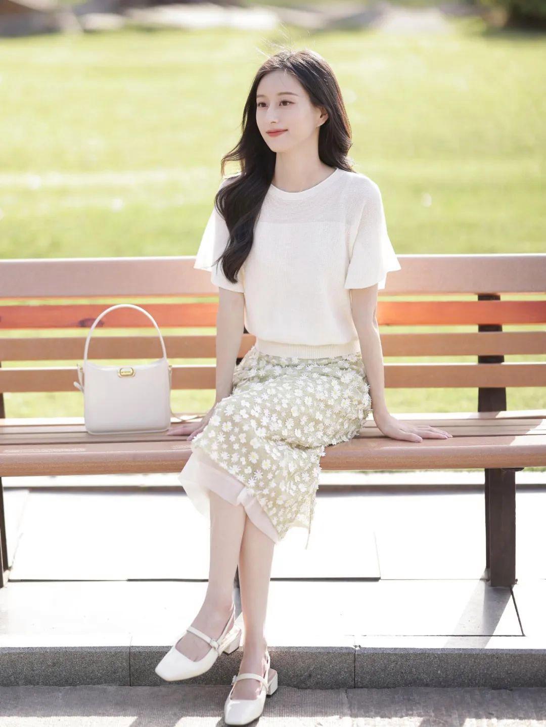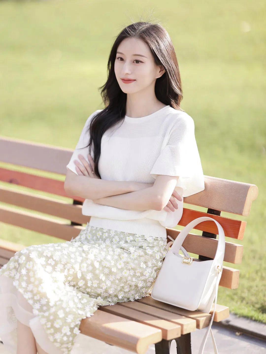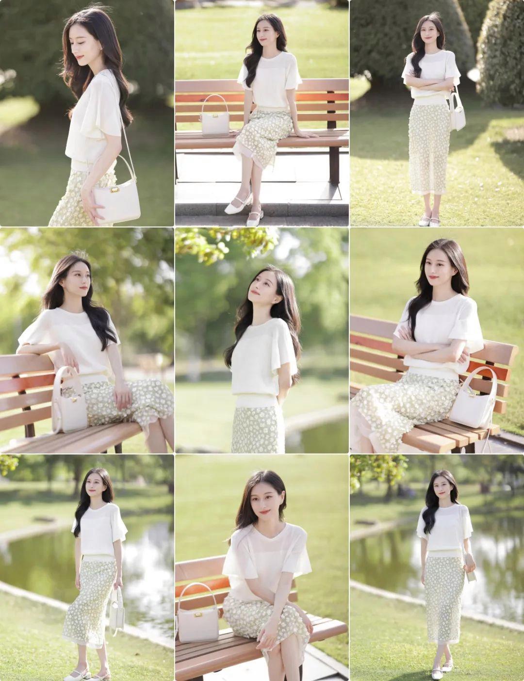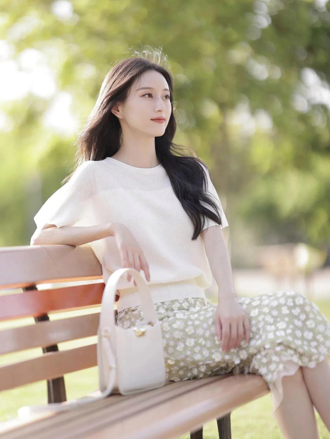 穿裙子拍照时,如果有长椅可以利用,不妨尝试侧坐姿势。一只手轻轻搭在椅背上,头略微侧向远方,裙子自然垂落在身侧,营造出一种静谧的文艺氛围。整体画面充满故事感,知性又有层次。