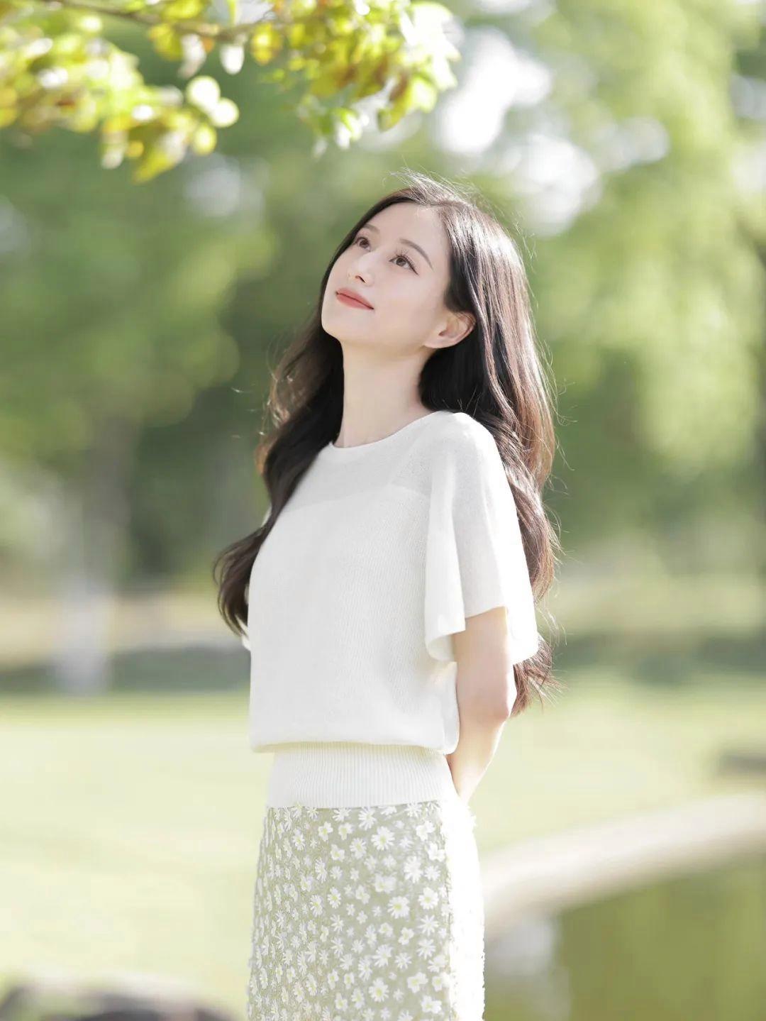 穿裙子拍照,最能展现气质的动作之一就是——侧身站立、仰头看远。这个姿势非常适合拍户外照,比如公园或者树林等,风吹动裙摆的同时,整个人显得轻盈通透,画面透出一种松弛又温柔的氛围感,优雅大方非常上镜。
