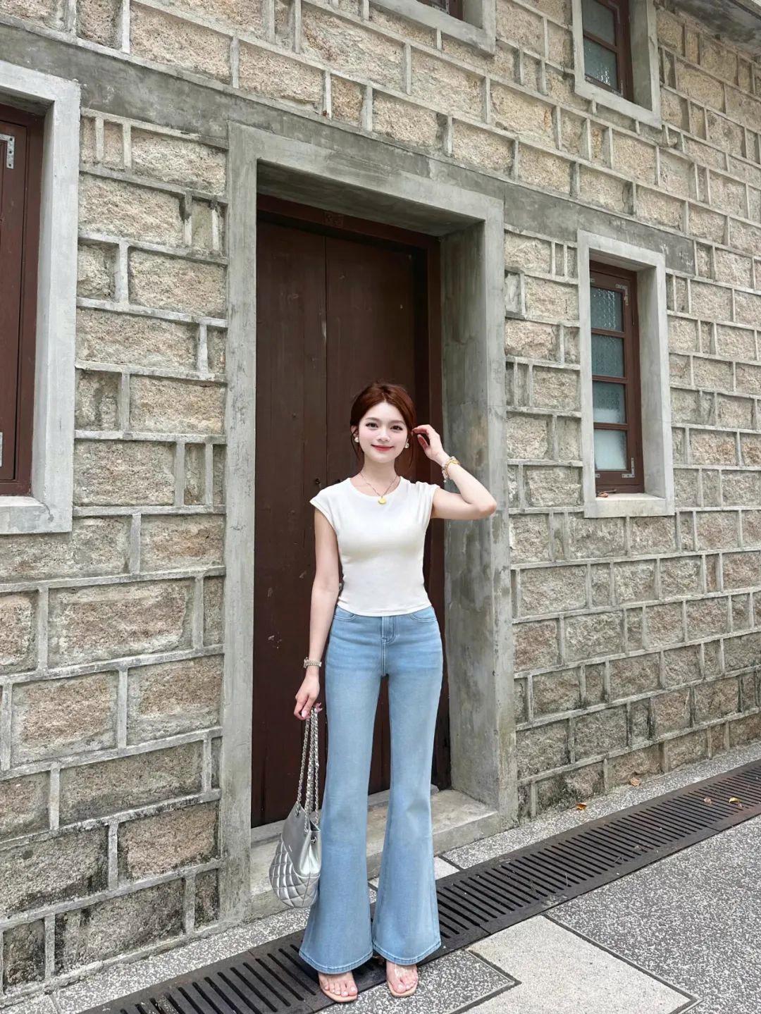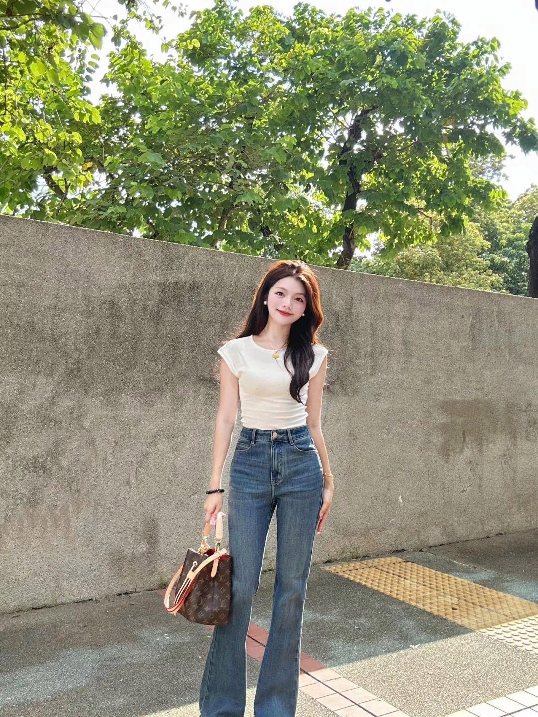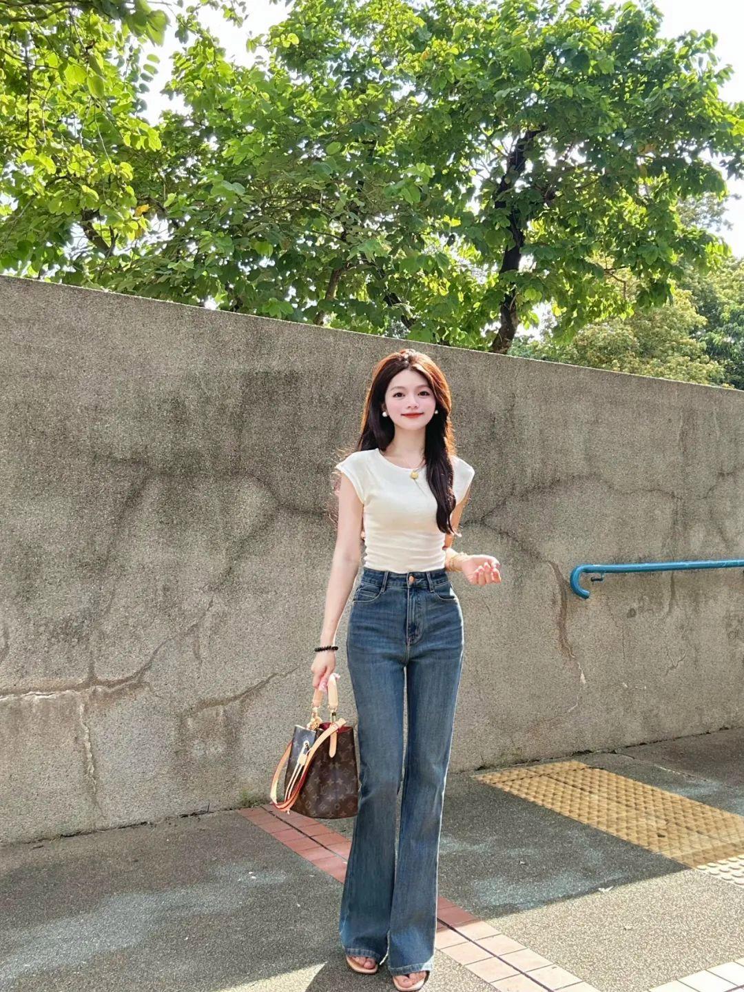 穿牛仔裤拍全身照,一手提包,另一侧腿微曲脚站立,身体呈现出轻松自然的状态。配合自然微笑看镜头,不仅能展现女性的柔美线条,还能突出好身材,营造出大方显高的氛围感。