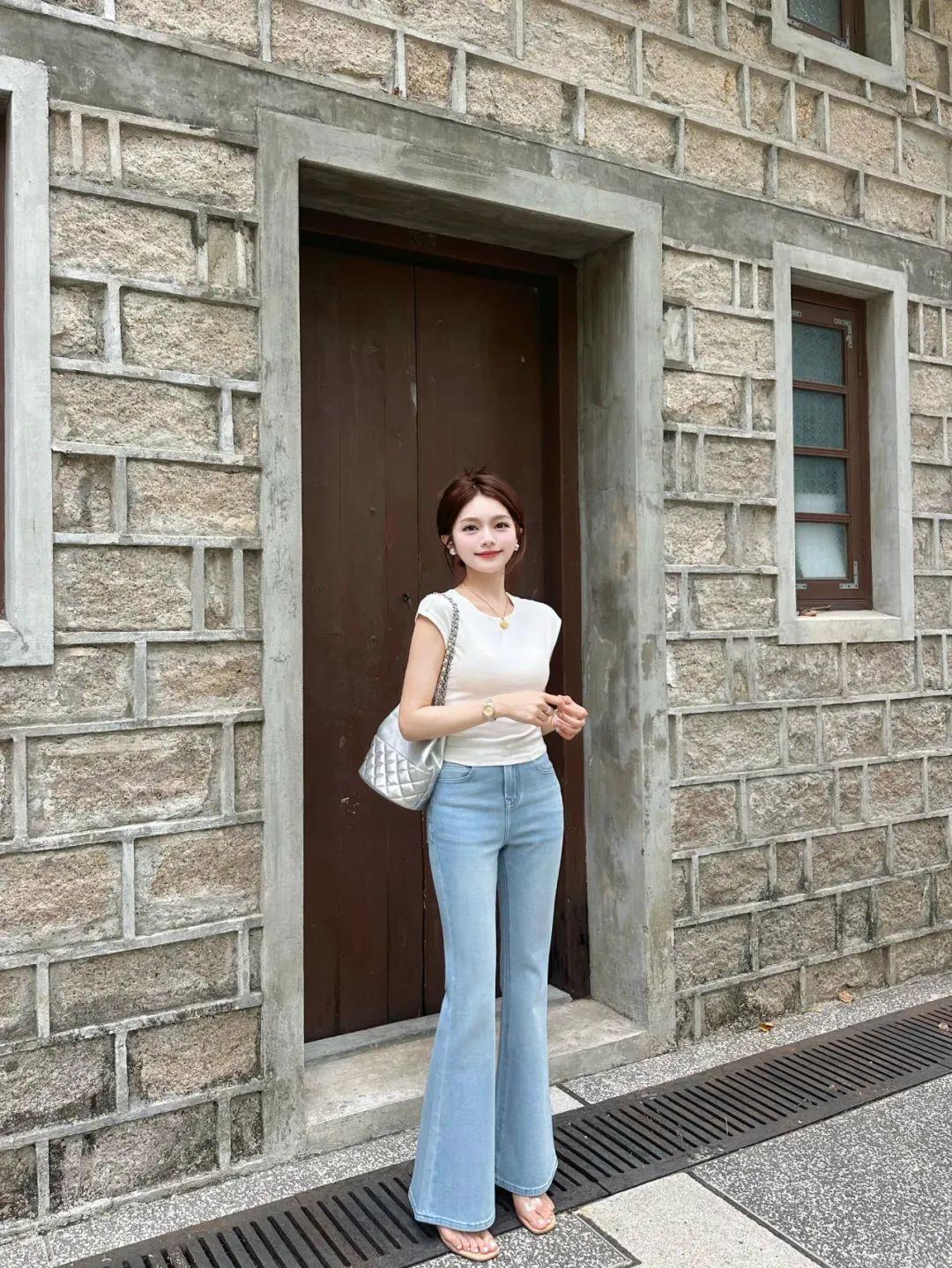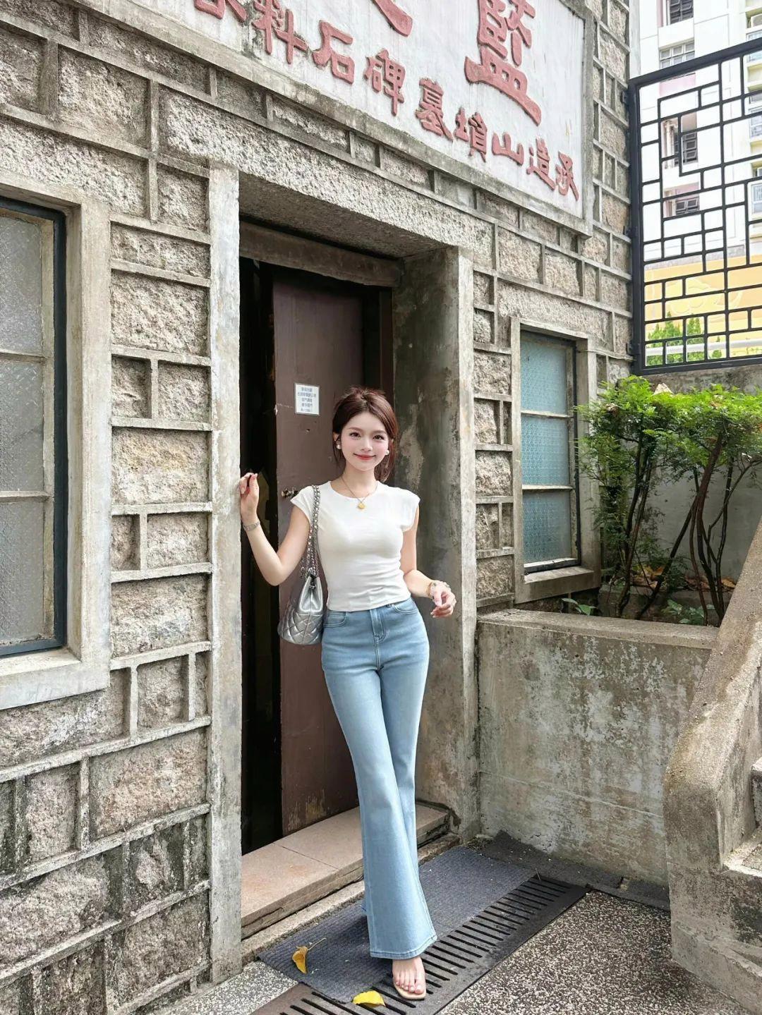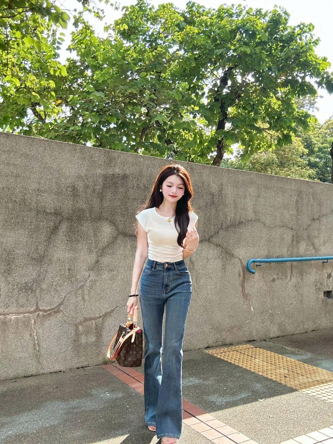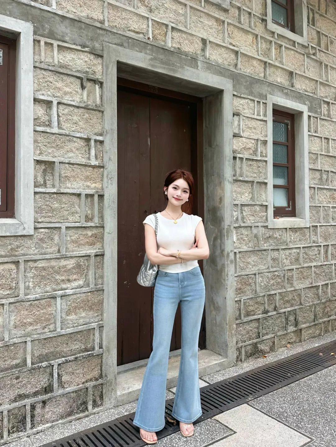 穿牛仔裤拍全身照,一手提包,另一侧腿微曲脚站立,身体呈现出轻松自然的状态。配合自然微笑看镜头,不仅能展现女性的柔美线条,还能突出好身材,营造出大方显高的氛围感。